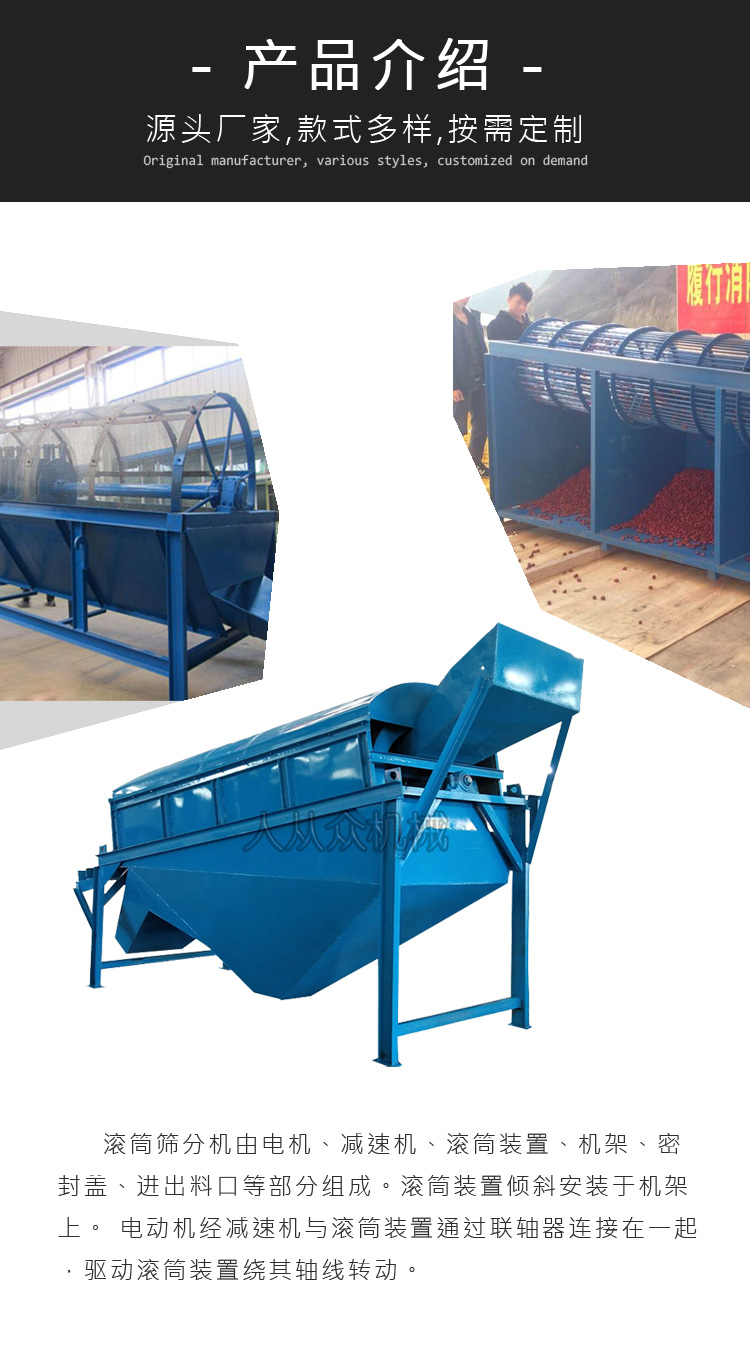 滾筒篩分機(jī)適用于紅棗篩分、大棗核桃干果大小分選篩選機(jī),刨花鋸末顆粒篩分、各種家畜有機(jī)肥的篩分設(shè)備,歡迎來電咨詢定制