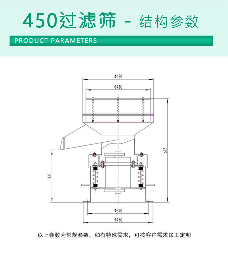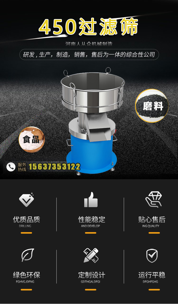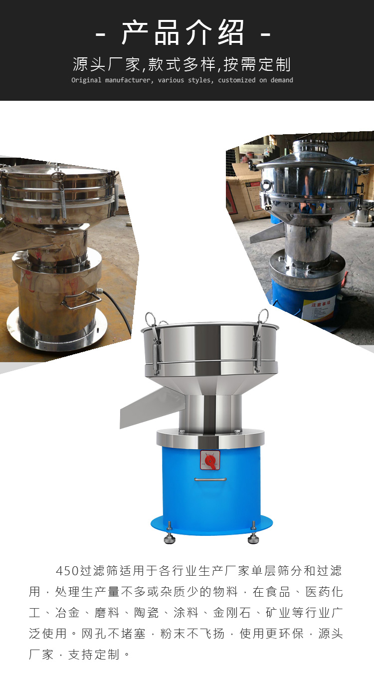 450過濾篩適用于產量要求不大或雜質較少的物料,如食品行業果汁、豆漿、奶粉、醬油醋、糖、鹽等物料,造紙行業的各種涂料、泥漿、廢液等物料,冶金行業的各種金屬粉末等物料;醫藥行業的各種顆粒粉末的篩分等。