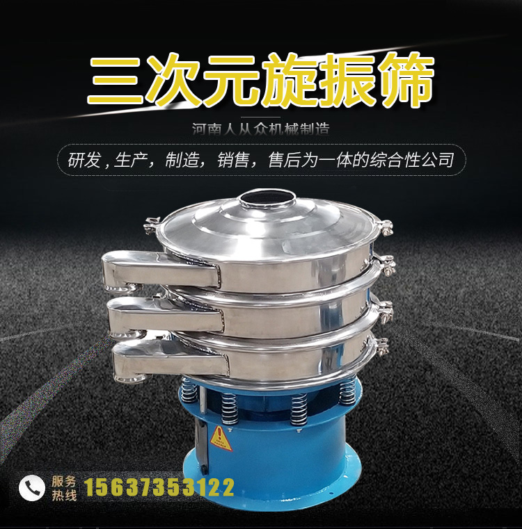 三次元旋振篩,我們可以從字面了解到它的運動軌跡是三維立體的,它使用直立式電機作為激振源,在電機的上端和下端安裝偏心塊,將電機的旋轉運動轉換為水平、垂直和傾斜的三維運動,然后將該運動傳輸到篩面,使物料在篩面上做外擴漸開線運動,故該系列振動篩稱之為旋振動篩。