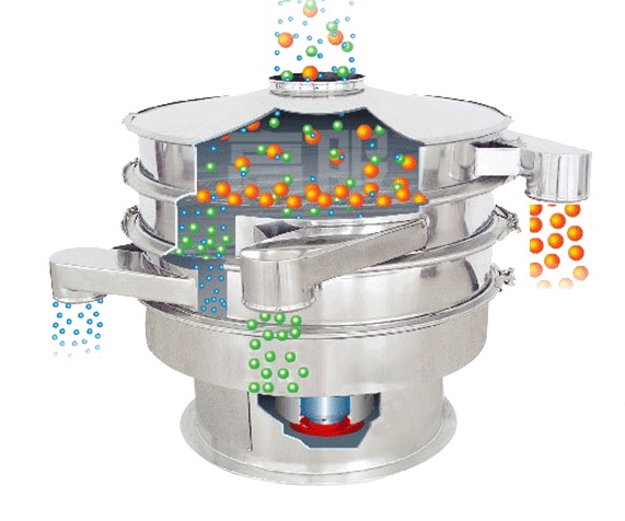 圓形振動篩的工作原理是將要分離的物料通過料斗(振動篩頂部的小孔)喂入,篩網/篩子將開始振動,然后,送入料斗的物料將根據顆粒大小穿過篩子,大于篩孔的顆粒留在篩面上,稱為的篩上物,小于篩孔的顆粒透過篩孔,稱為篩下物。